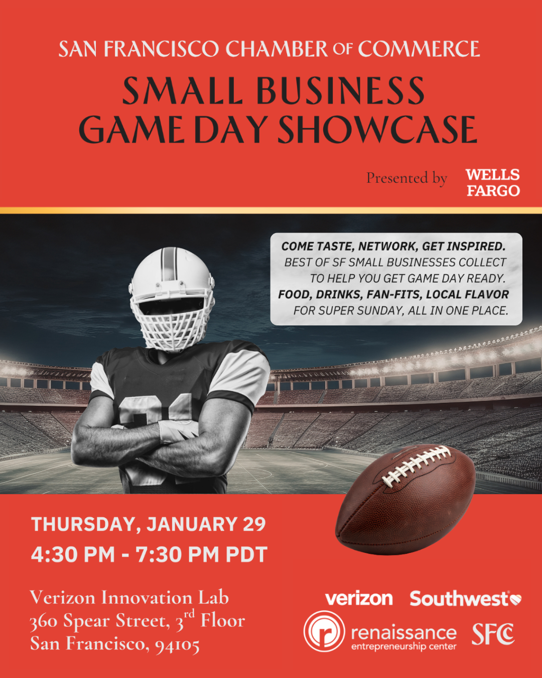 Co-produced by the San Francisco Chamber of Commerce and the Renaissance Entrepreneurship Center, with support from Wells Fargo and Verizon. This event brings together the best of San Francisco’s small businesses to help you get fully Game Day ready.